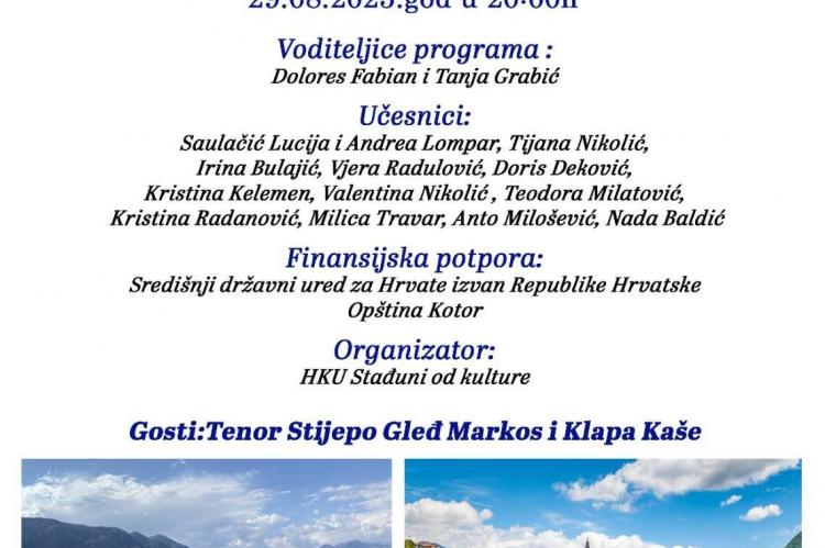 Posebnu atmosferu večeri upotpunit će gostujući tenor Stijepo Gleđ Markos i Klapa Kaše, koji će svojom interpretacijom donijeti dašak dubrovačke i dalmatinske glazbene tradicije.