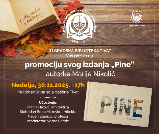 JU Gradska biblioteka Tivat organizira promociju svog novog izdanja “Pine”, autorice Marije Nikolić, koja će se održati u nedjelju, 30. 11., s početkom u 17 sati, u Multimedijalnoj dvorani Općine Tivat.
