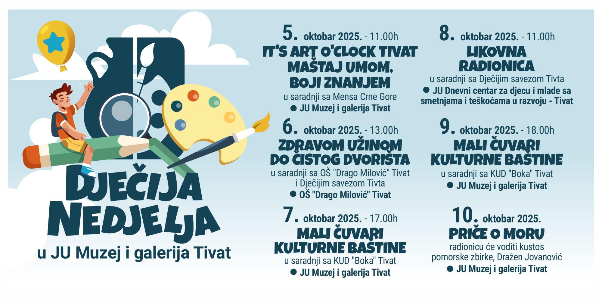 Povodom obilježavanja „Dječije nedjelje“, JU Muzej i galerija Tivat pripremila je bogat i raznovrstan program za najmlađe. Na priloženom plakatu možete pogledati što sve mališane očekuje tijekom trajanja ove manifestacije.