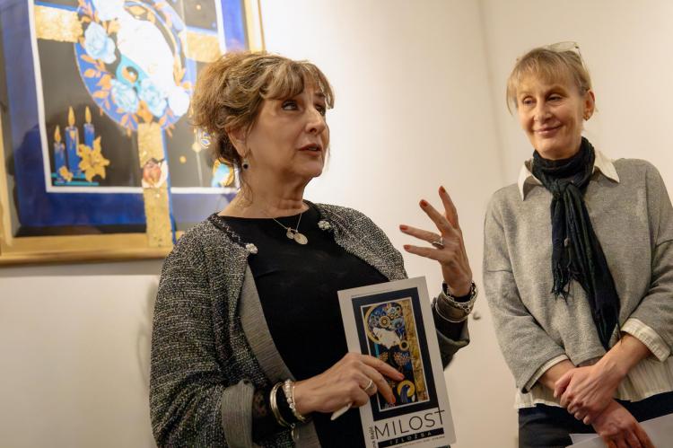 Govoreći o autorici, apostrofirala je njezin bogat umjetnički put te istaknula kako u svom radu koristi reduciranu paletu boja - zlatnu, plavu i crnu, koje simboliziraju snagu, duhovnost i tišinu.