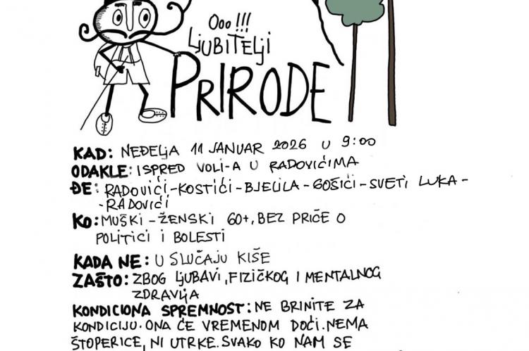 Ljubitelji prirode okupit će se u nedjelju, 11. 1., u 9 sati, ispred prodavaonice „Voli“ u Radovićima, na još jednoj organiziranoj pješačkoj turi.