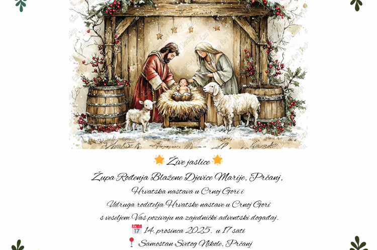 Župa Rođenja Blažene Djevice Marije, Hrvatska nastava u Crnoj Gori te Udruga roditelja Hrvatske nastave u Crnoj Gori srdačno pozivaju na svečani adventski događaj “Žive jaslice”.