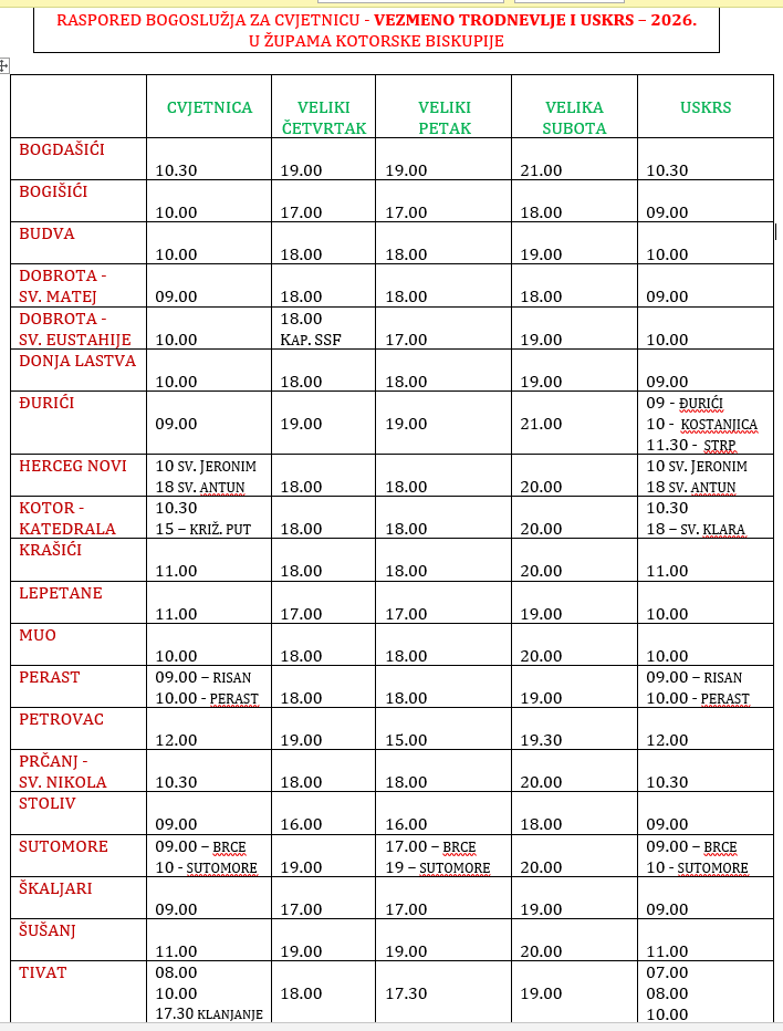 Time to read less than 1 minute Share Print a- a+ Read so far Ponedjeljak, 30. ožujka 2026. - 9:35Autor: Radio DUX Raspored bogoslužja za Vazmeno trodnevlje i Uskrs u župama Kotorske biskupije možete pogledati na priloženom plakatu. Izvor: Kotorska biskupija