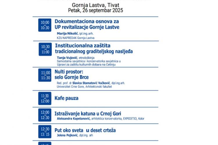 U petak, 26. 9., s početkom u 10:00 sati, u Domu kulture u Gornjoj Lastvi, održat će se stručni skup i razgovor posvećen vernakularnoj, odnosno ruralnoj arhitekturi. Skup se organizira u sklopu manifestacije Dani europske baštine, koja se pod pokroviteljstvom Europske komisije i Vijeća Europe obilježava diljem Europe, a u Crnoj Gori se provodi pod okriljem Ministarstva kulture.