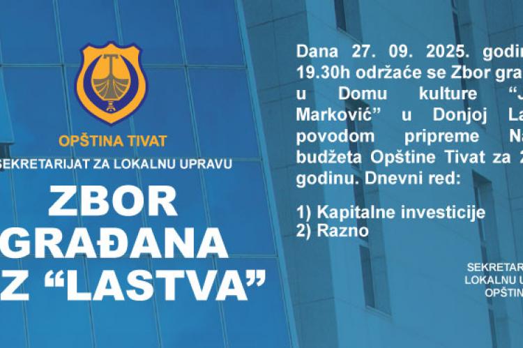 Sekretarijat za lokalnu upravu Općine Tivat obavještava javnost da će se zbor građana Mjesne zajednice Lastva održati u subotu, 27. rujna, s početkom u 19:30 sati, u Domu kulture “Josip Marković” u Donjoj Lastvi.