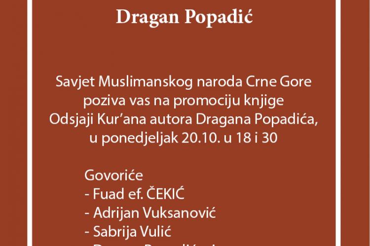 Promocija nove knjige tivatskog novinara i pjesnika Dragana Popadića “Odsjaji Kur'ana” održat će se u ponedjeljak, 20. 10., u prostorijama Kulturnog centra Muslimana u Podgorici, s početkom u 18:30.