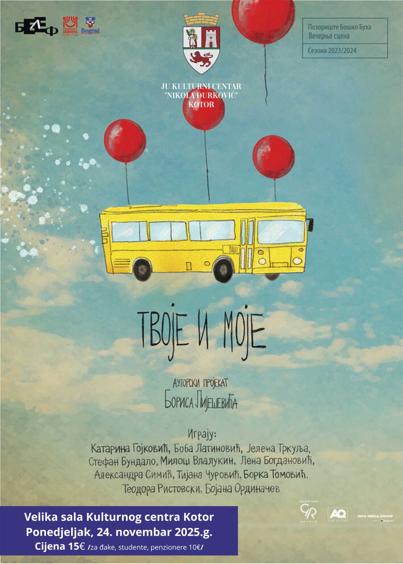 Drugo kazališno  gostovanje zakazano je za ponedjeljak,  24. 11., u 20 sati, kada će publika imati priliku  pogledati  autorski projekt Borisa Liješevića – „Tvoje i moje“, u produkciji kazališta „Boško Buha“ iz Beograda.