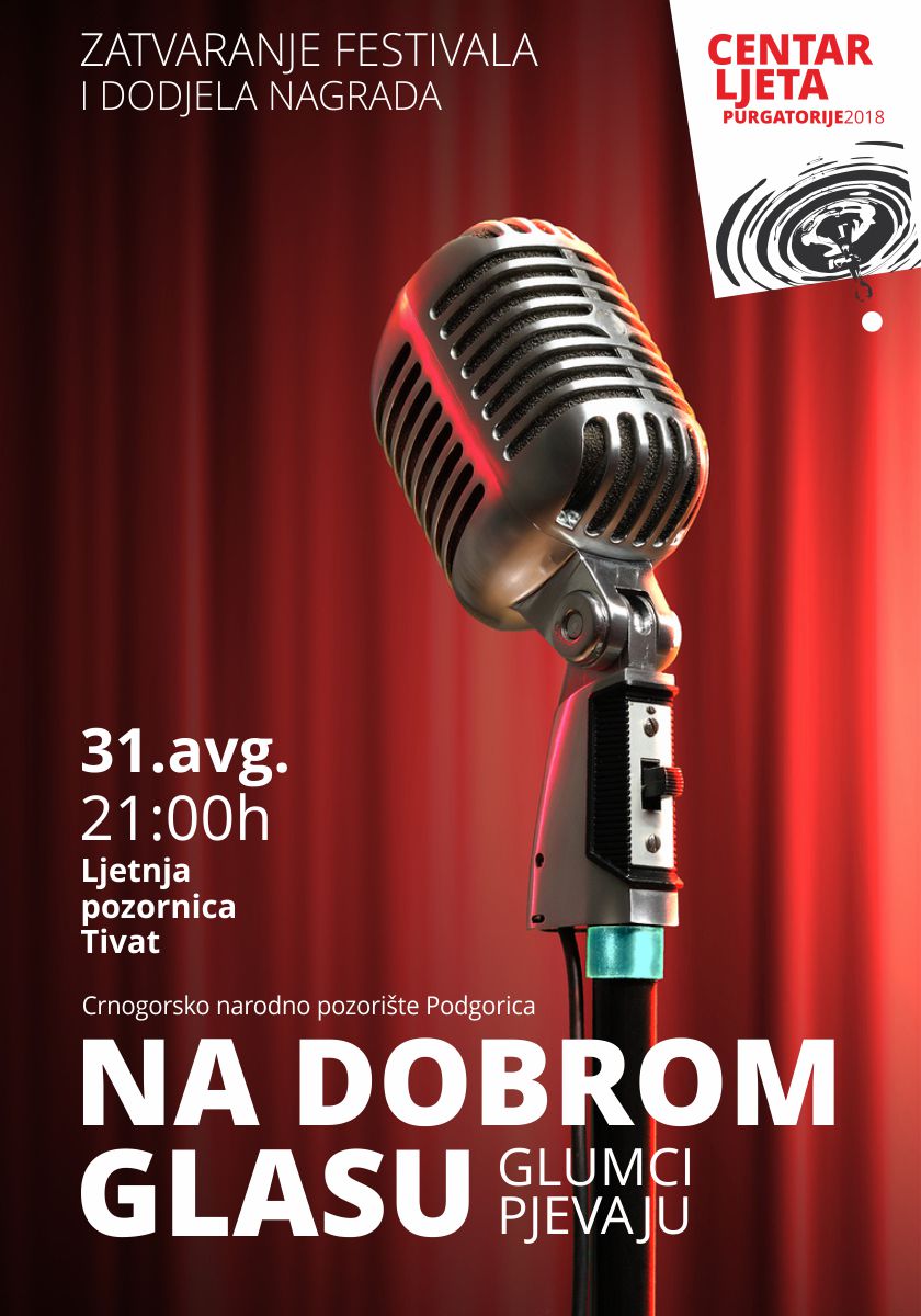 U petak, 31.8., povodom zatvaranja XIII, festivala “PURGATORIJE” na Ljetnoj pozornici Tivat u 21 sat bit će održan glazbeno-scenski spektakl  pod nazivom „Na dobrom glasu“. Uz pratnju revijalnog orkestra CNP-a pod dirigentskom palicom Radovana Papovića, crnogorski glumci će  izvoditi popularne pop, rock i džez melodije, govoriti poeziju i plesati.
