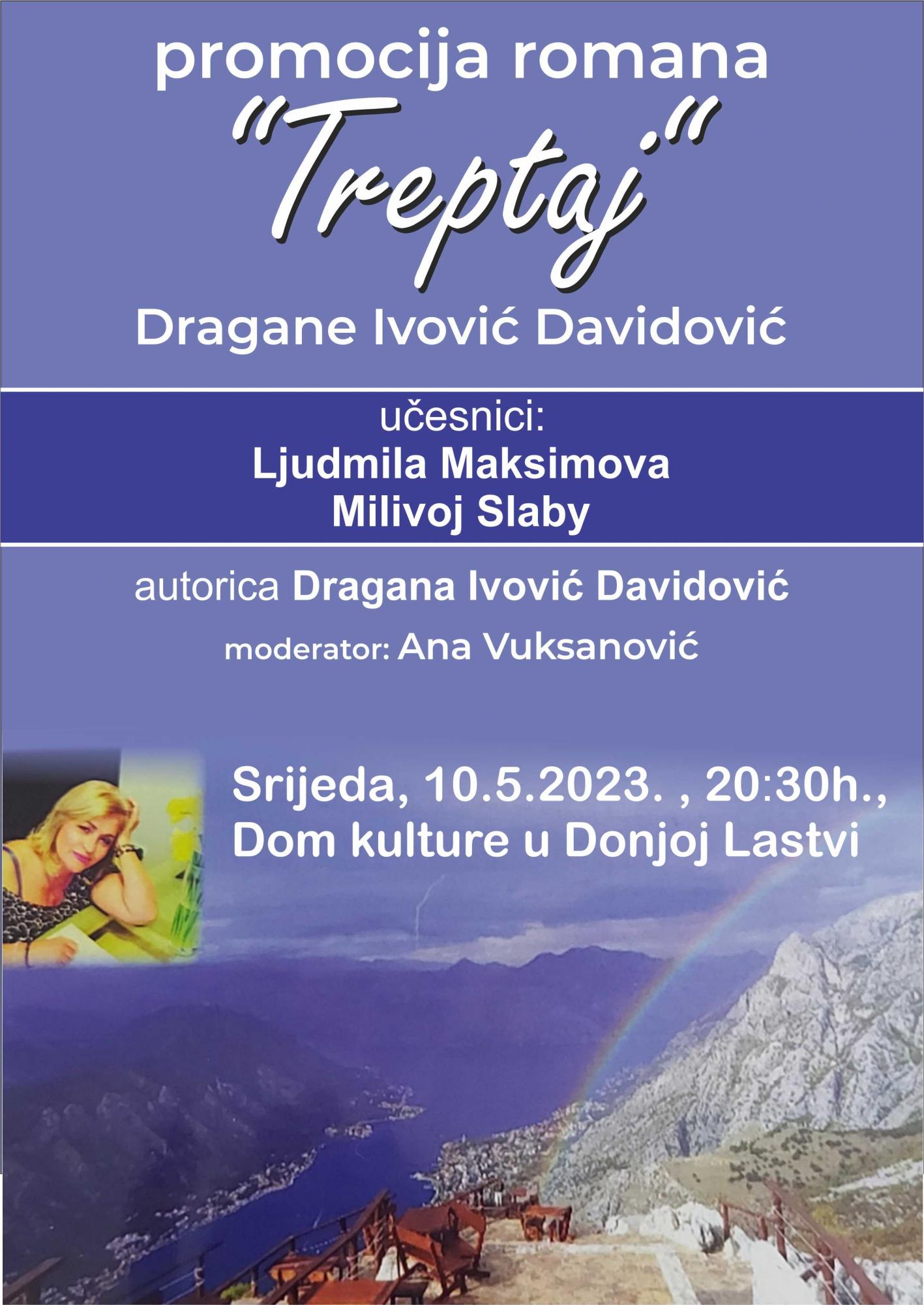 Promocija romana ,,Treptaj”, Dragane Ivović Davidović, održat će se u srijedu, 10. 5. 2023., u Domu kulture ,, Josip Marković” u Donjoj Lastvi. Roman prvijenac Dragane Ivović Davidović predstavit će Ljudmila Maksimova i autorica, dok će moderatorica biti Ana Vuksanović.