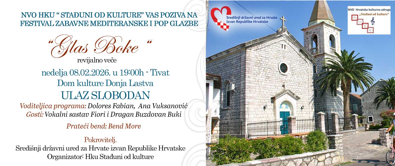 U Domu kulture Josip Marković u Donjoj Lastvi, u nedjelju, 8. 2., s početkom u 19 sati, održat će se revijalna večer Festivala zabavne mediteranske i pop glazbe „Glas Boke“.