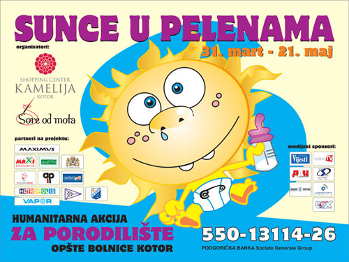 U sklopu humanitarnog projekta „Sunce u pelenama" za pomoć porodilištu Opšte bolnice u Kotoru ,u ponedeljak - sutra 21.svibnja biće održana i poslednja akcija - Veliki donatorski bal s početkom u 20h.