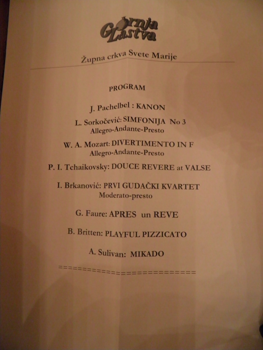Na programu sinoćnjeg koncerta bila su djela Pachelbela, Sorkočevića, Mozarta, Tchaikovsky, Brkanovića, Faure, Brittena, Sulivana.