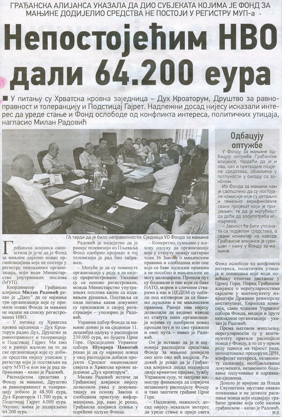 slobodni smo zamoliti Vas u ime Hrvatske krovne zajednice-Dux Croatorum da u jednome od slijedećih brojeva Vaših cijenjenih novina objavite našu reakciju na članak koji je objavljen 17. decembra 2012. g. pod naslovom „Nepostojećim NVO dali 64.200 eura". U uvodu ovoga članka nalazi se tekst koji stavlja Hrvatsku krovnu zajednicu-Dux Croatorum u položaj krivca. Nepotpisani autor Vašega članka prenosi izjavu g. Milana Radovića koordinatora Građanske alijanse i tvrdi da je Hrvatska krovna zajednica –Dux Croatorum dobila sredstva od Fonda za manjine premda nije registrirana. Uvjereni smo da je riječ o nesporazumu, odnosno da gospodin Radović, a sukladno njemu i Vaš novinar, nisu upoznati sa pravim stanjem stvari glede registracije naše Udruge.