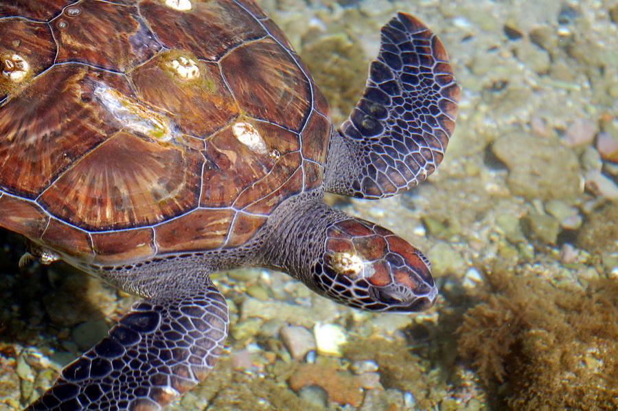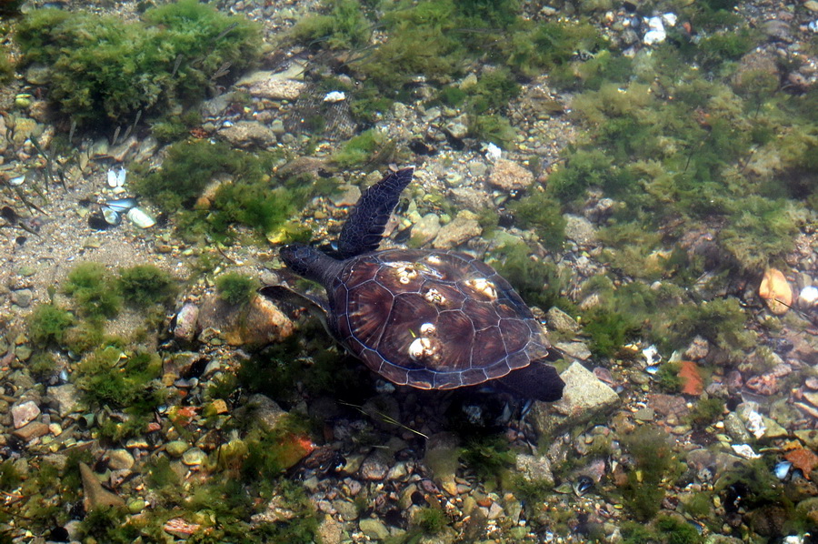 Želio bih da sa vama podjelim jedno prelijepo iskustvo koje me ostavilo bez daha kada sam ispred naše ponte jedno jutro ugledao malu morsku kornjaču. Kretala se veoma lagano veoma blizu obale i nije obraćala pažnju na to što sam bio u neposrednoj blizini. Graciozno se okretala i tražila nešto za doručak.