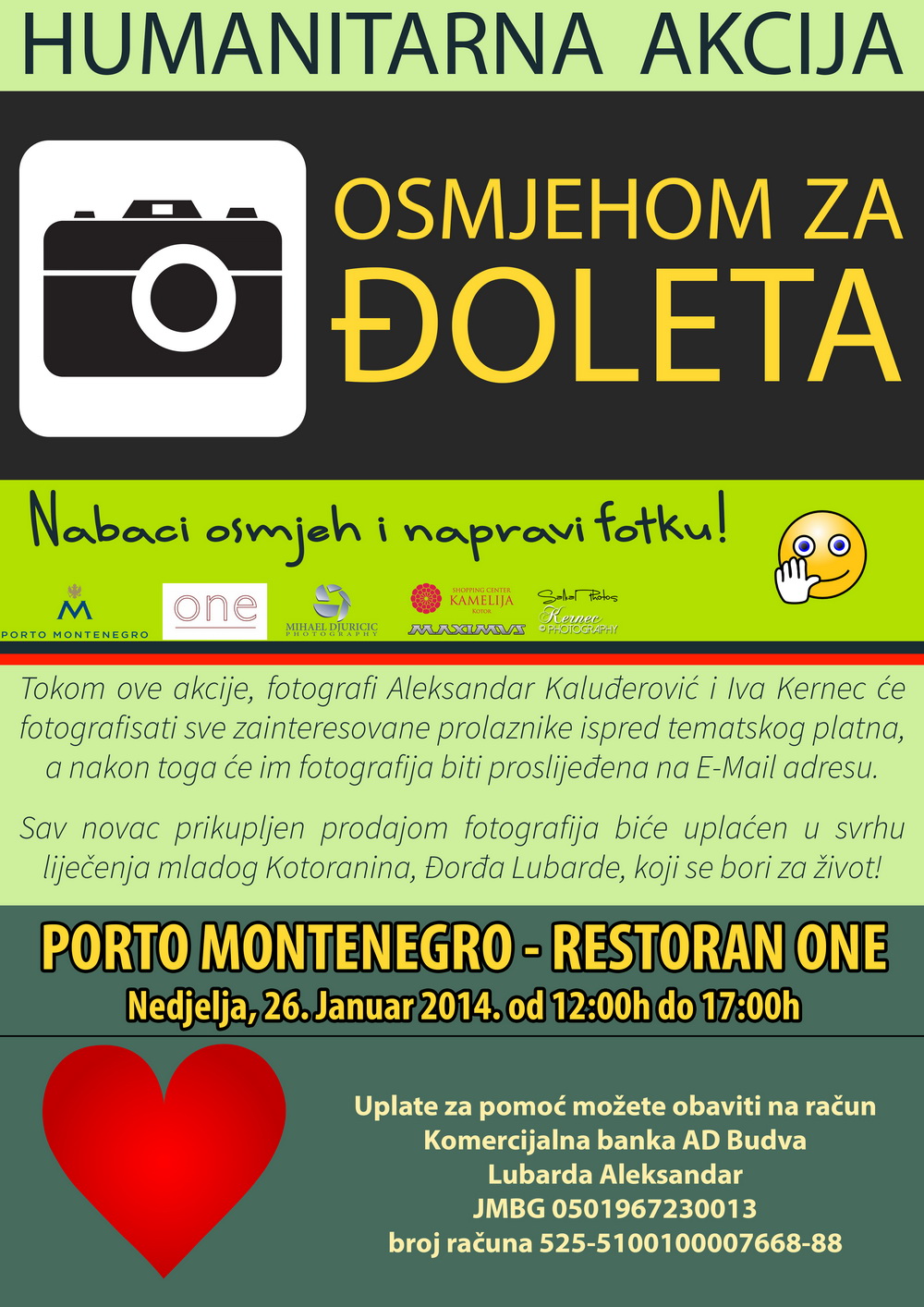 "Dođite u Porto Montenegro, 26. siječnja (nedjelja) u restoran „One" i osmjehom podržite našu akciju. Vaš iskren osmjeh, upućen Đorđu Lubardi, može pomoći više nego što mislite. Platite svoju fotografiju po cijeni koju vi odredite, a sav novac ići će za Đoletovo liječenje. Potom će vaša fotografija biti proslijeđena na E-Mail koji naznačite.