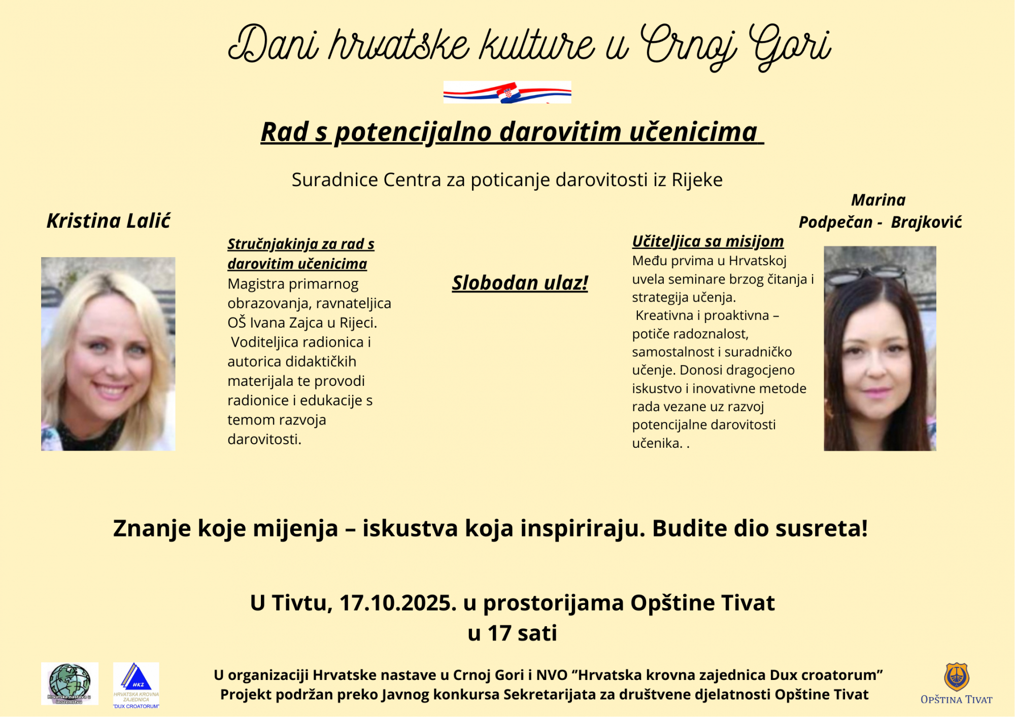 Hrvatska nastava u Crnoj Gori, u suradnji s NVO Hrvatska krovna zajednica Dux Croatorum , organizira manifestaciju Dani hrvatske kulture u Crnoj Gori – susret u kojem se s ponosom čuva, predstavlja i dijeli bogatstvo hrvatske riječi, pjesme, umjetnosti i običaja. Događaj okuplja sve ljubitelje hrvatske kulture u duhu zajedništva, identiteta i kulturnih razmjena.