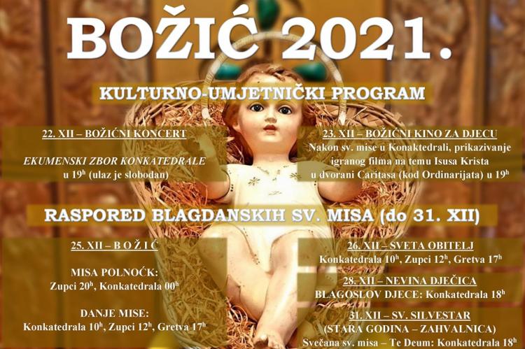 Time to read less than 1 minute Share Print a- a+ Read so far Srijeda, 22. prosinca 2021. - 12:01Autor: Radio DUX Božićni koncert ekumenskog zbora konkatedrale svetog Petra, održat će se večeras, s početkom u 19 sati. Također, na priloženom plakatu možete pogledati raspored blagdanskih svetih misa.