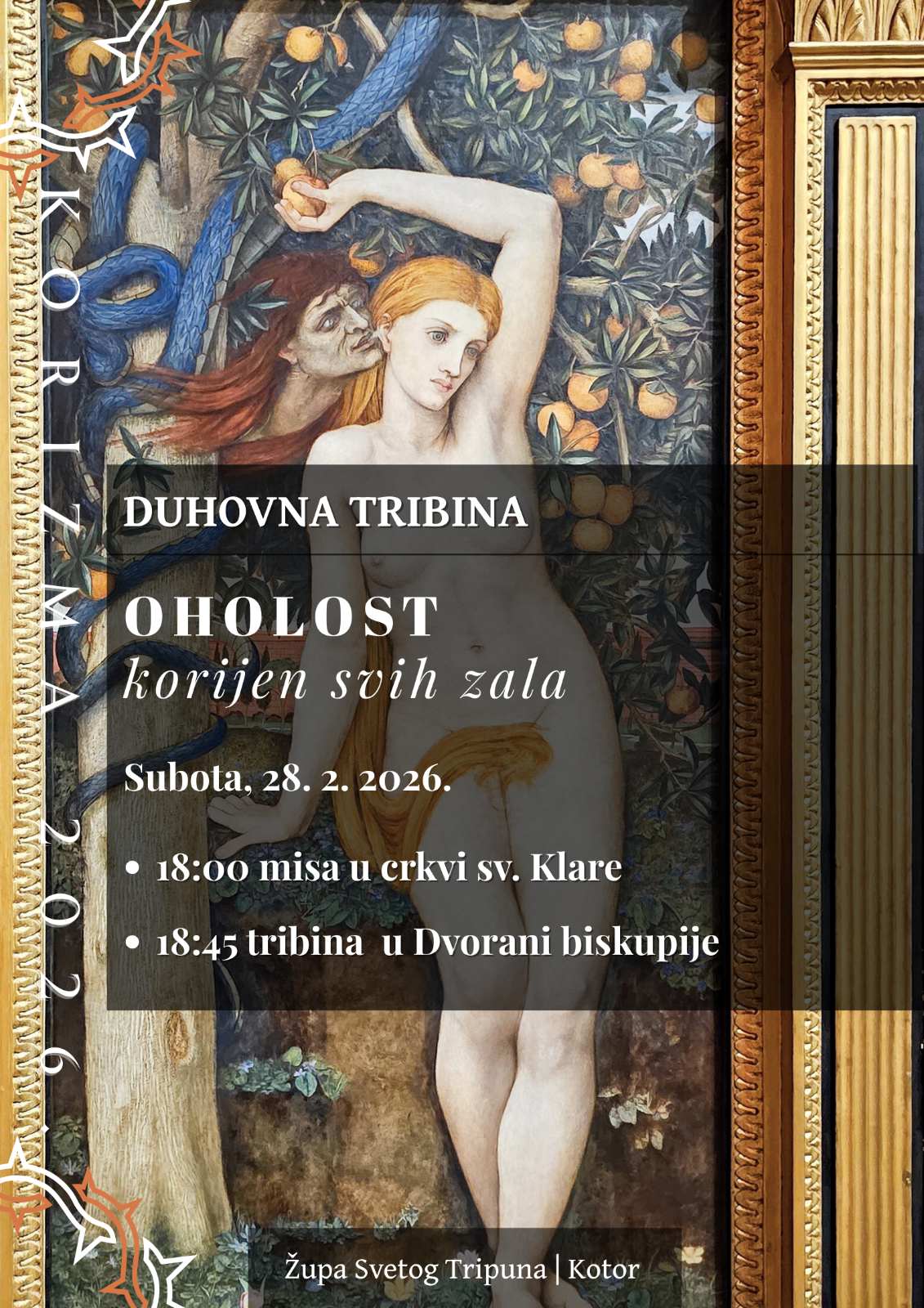 Župa Svetog Tripuna u Kotoru organizira duhovnu tribinu pod nazivom „Oholost – korijen svih zala“, koja će se održati danas, 28. veljače 2026. godine. Program započinje svetom misom u 18 sati u crkvi sv. Klare, dok će se tribina održati u 18:45 sati u Dvorani biskupije.