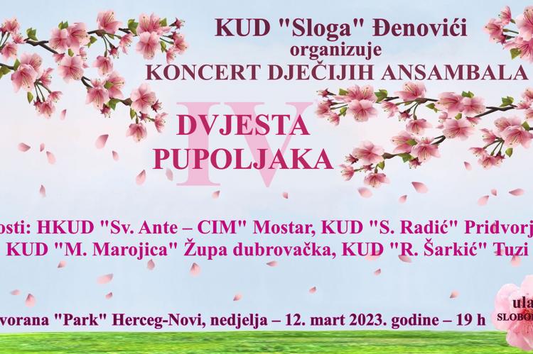KUD „Sloga“ Đenovići organizira koncert dječjih ansambala „Dvjesta pupoljaka“, u Dvorani Park, u Herceg Novom, 12.3., s početkom u 19 sati.