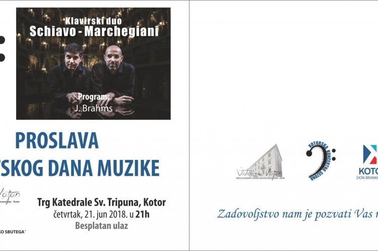 Povodom obilježavanja Svjetskog dana glazbe u organizaciji ŠOSMO “Vida Matjan” Kotor i KotorArt “Don Brankovi dani muzike” u četvrtak, 21. 6., ispred katedrale sv. Tripuna, s početkom u 21h, održat će se koncert klavirskog dua: Schiavo- Marchegiani. Na programu kompozicije J.Brahmsa.