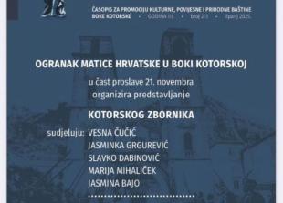 Ogranak Matice hrvatske u Boki kotorskoj organizira promociju novog broja Kotorskog zbornika. Promocija će se održati u subotu, 22. 11., u 18 sati, u Koncertnoj dvorani Muzičke škole - crkvi Svetog Duha.