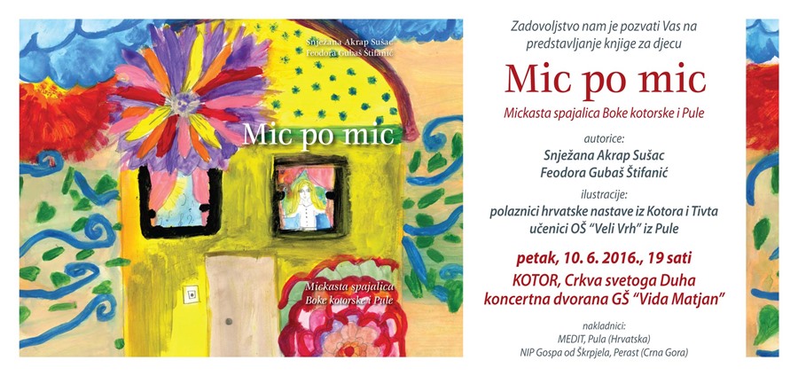 „Mic po mic“ će biti predstavljena lijepim programom u koncertnoj dvorani glazbene škole „Vida Matjan“, odnosno crkvi svetoga Duha u Kotoru 10. lipnja u 19 sati. Sve vas pozivamo da mickamo zajedno. Nakon promocije bit će dodjela učeničkih knjižica polaznicima hrvatske nastave u Crnoj Gori, generaciji 2015./2016.