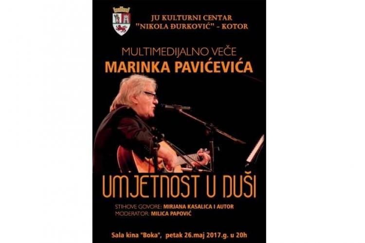 Multimedijalna  večer crnogorskog kantautora Marinka Pavićevića bit će održana u dvorani Kina  „Boka" u petak,  26.5.,  s početkom u 20 sati. Stihove će govoriti Mirjana Kasalica i autor. Moderatorica  programa će biti  Milica Papović, predsjednica Književnog kluba „More" iz Tivta. Ulaz je slobodan.