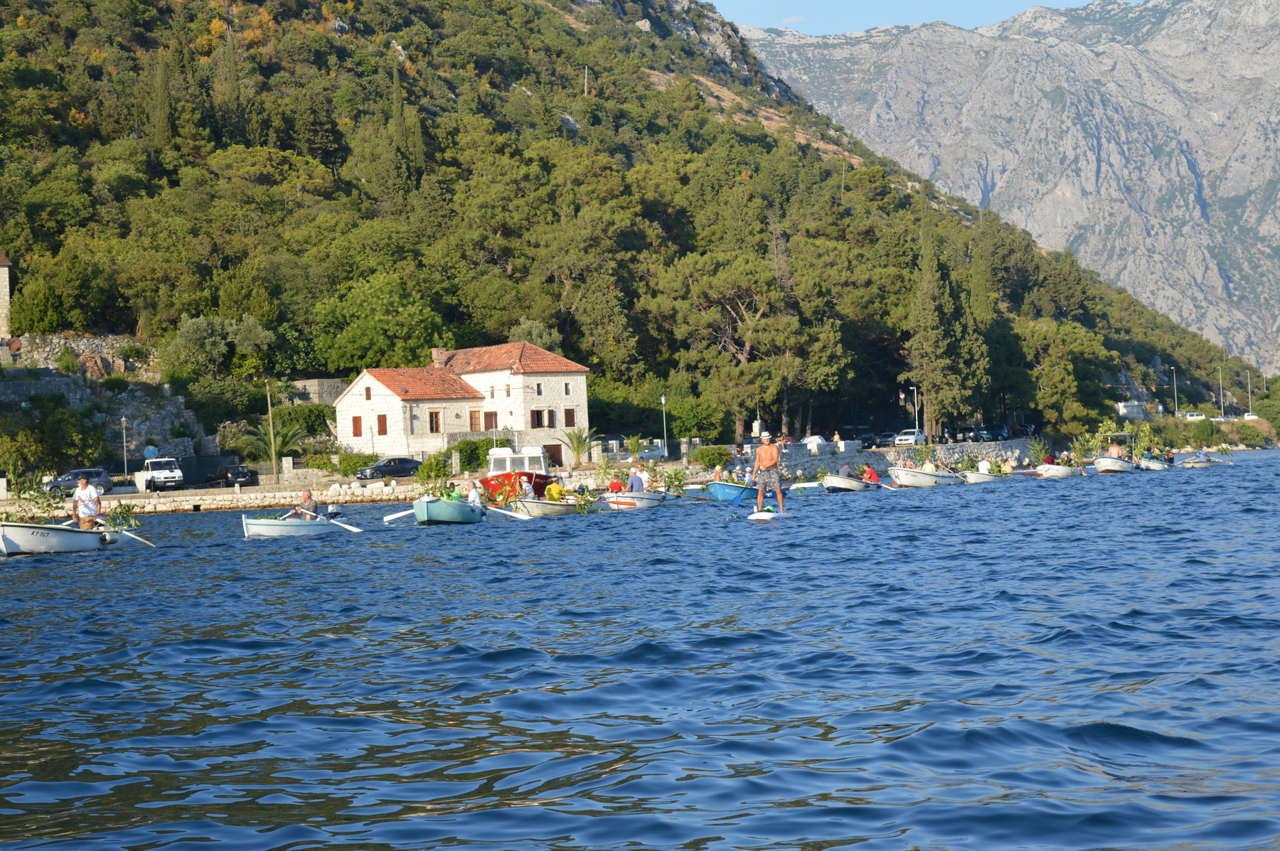 U čast Gospi, svakog 22. srpnja, barke povezane, okićene jablanovim granama i napunjene kamenjem u kojima su u prvoj barci župnik peraški i predstavnici Bokeljske mornarice, pjevaju Bugarštice veslajući prema otoku. Uz zvona crkve kada stignu ispred školja kamenje se baca u more.
