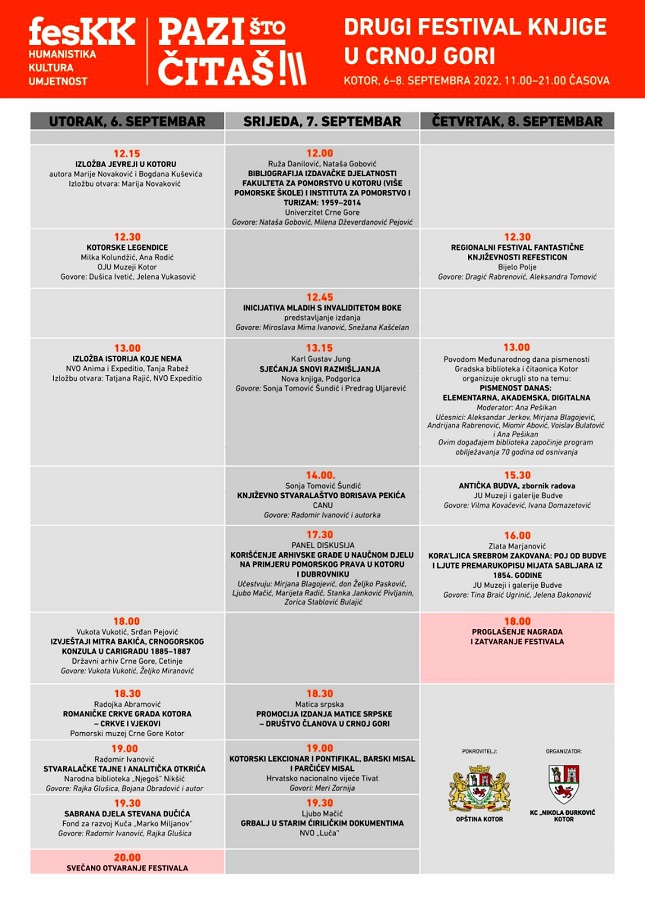 Sinoć je u galeriji Kulturnog centra ''Nikola Đurković'' Kotor otvoren Drugi festival knjige – humanistike, kulture i umjetnosti u Crnoj Gori – FeskK Kotor (FesKK) PAZI ŠTO ČITAŠ! koji će trajati od 6. do 8. 9. u Kotoru.