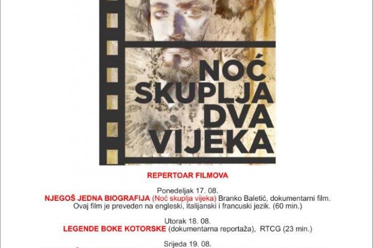 Ponedjeljak (17.kolovoz) - NJEGOŠ JEDNA BIOGRAFIJA (Noć skuplja vijeka) Branko Baletić, dokumentarni film. Preveden je na engleski, talijanski i francuski jezik ( trajanje 60 minuta).
