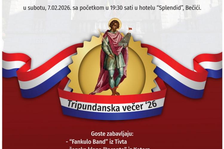 Hrvatsko građansko društvo Crne Gore, u povodu blagdana svetoga Tripuna, tradicionalno organizira Tripundansku večer, u subotu 7. veljače 2026. u Hotelu „Splendid” Bečići.