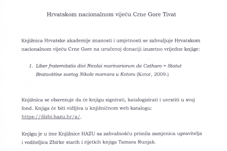 „Knjižnica Hrvatske akademije znanosti i umjetnosti se zahvaljuje Hrvatskom nacionalnom vijeću Crne Gore na uručenoj donaciji izuzetno vrijedne knjige: