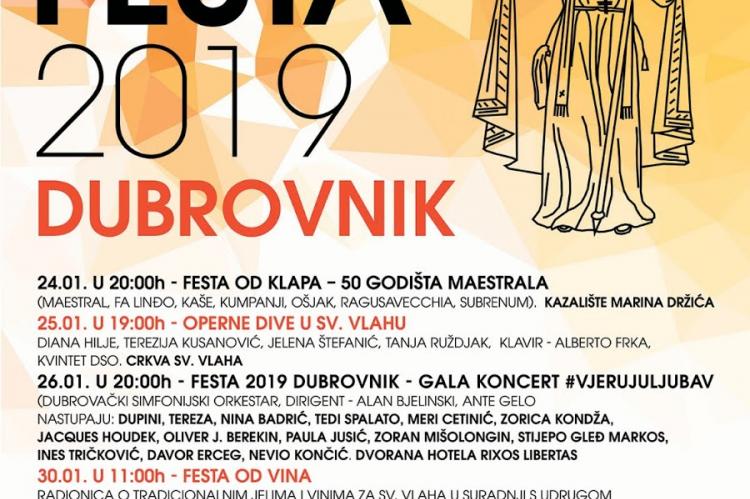 Osamnaesta po redu humanitarna manifestacija Festa 2019. Dubrovnik, organizirana u čast svetoga Vlaha i uz Dan Grada Dubrovnika, počet će tradicionalnom Festom od klapa u četvrtak, 24. siječnja 2019. u Kazalištu Marina Držića. Festom od klapa proslavit će 50 GODIŠTA MAESTRALA klape Maestral, FA Linđo, Kaše, Kumpanji, Ošjak, Ragusavecchia i Subrenum 24. siječnja u Kazalištu Marina Držića, gdje su u prodaji ulaznice za ovaj koncert.
