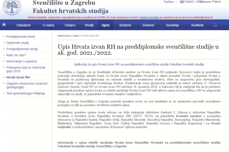 Obavijest i informacije o upisu mlađih naraštaja Hrvata izvan Republike Hrvatske na preddiplomske sveučilišne studije Fakulteta hrvatskih studija Sveučilišta u Zagrebu u akademskoj godini 2021./2022.