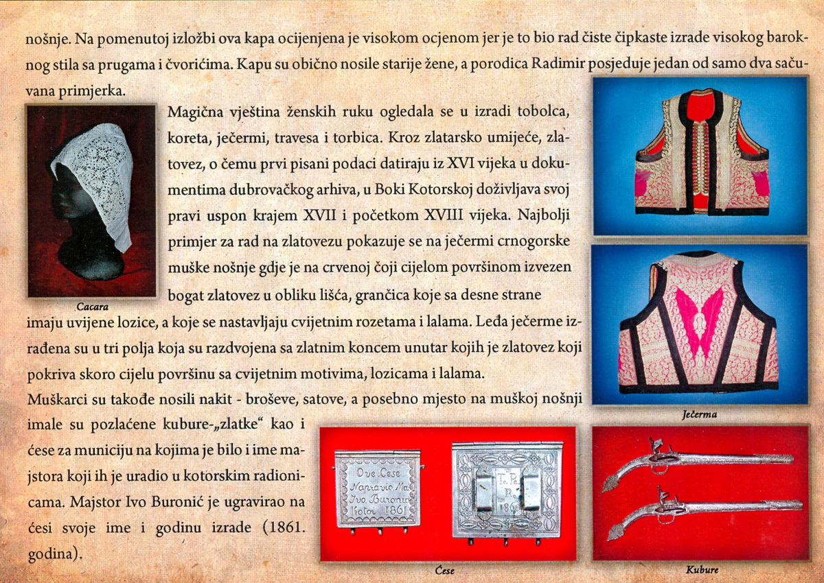 Svoje mjesto na izložbi našli su predmeti koji su iskovani u Kotoru, a koji su krasili bokeljsku narodnu nošnju, kubure iz XVIII. stoljeća, ćese, kao što je to primjer koji je uradio Ivo Burunić koji je ugravirao na ćesi i svoje ime i izradu 1861. godinu.