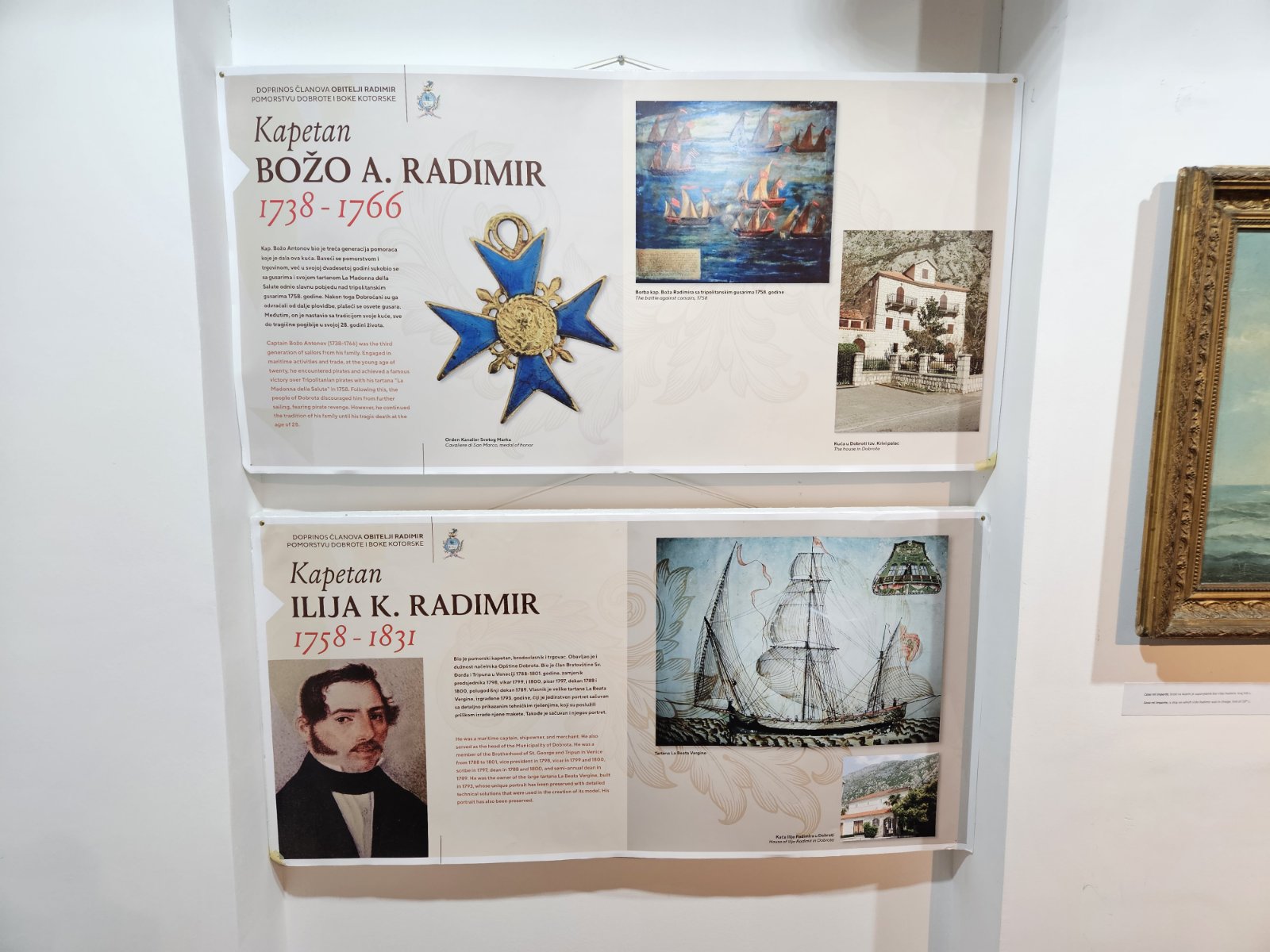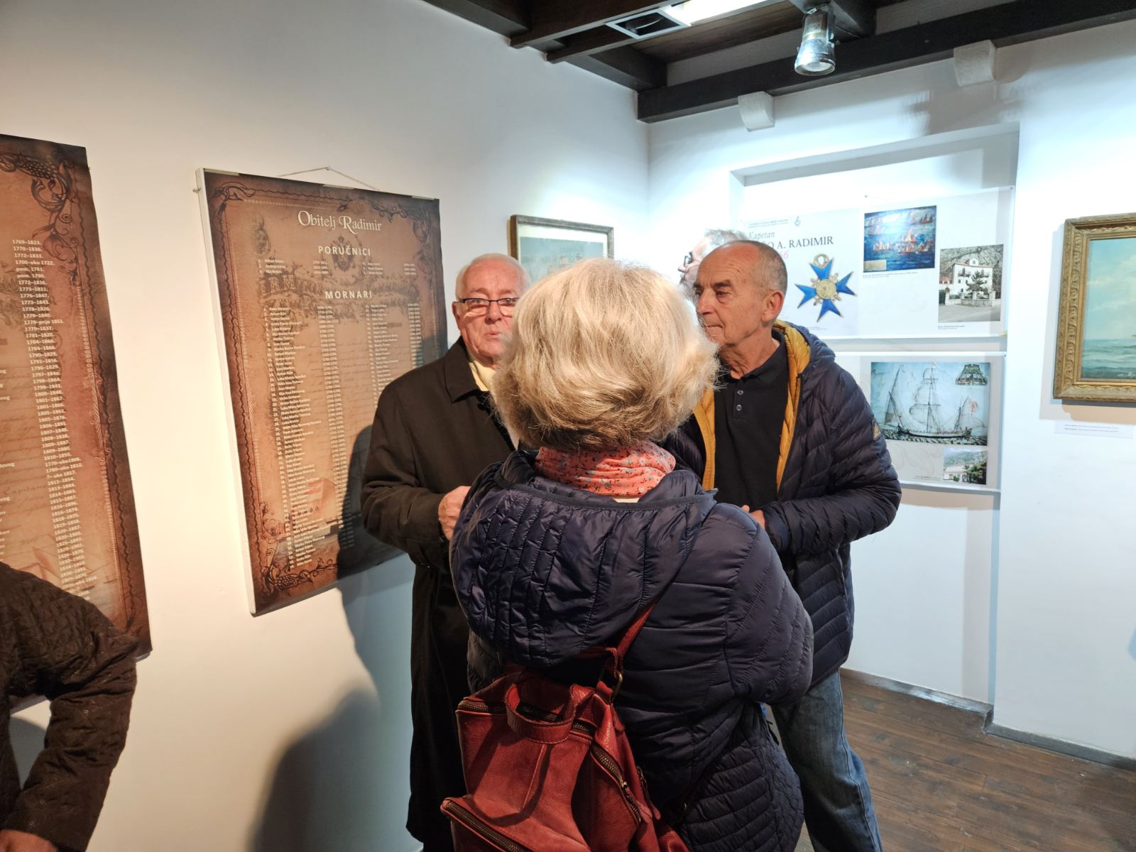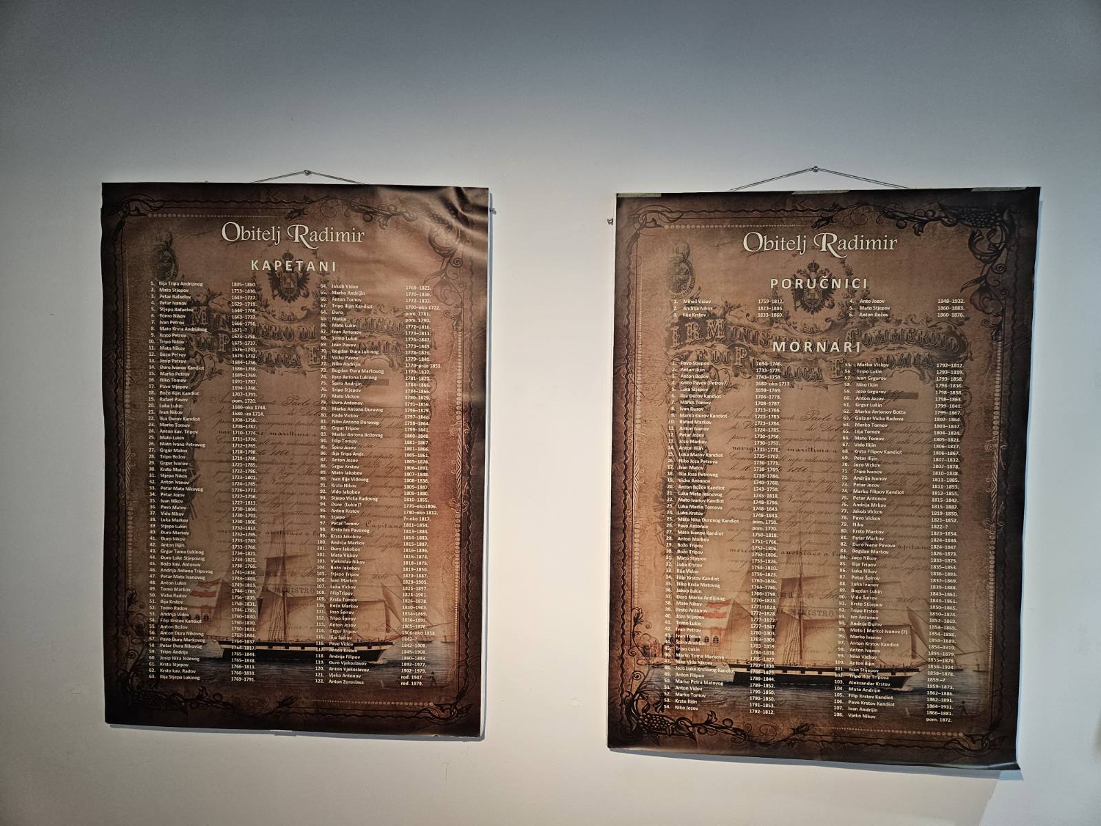 „U kotorskom Statutu Bokeljske mornarice ima jedan član, koji govori da je dozvoljeno da mornar može za svoj novac da kupi neku manju količinu robe i da je proda na drugo mjesto, bez da plati vlasniku broda bilo kakvu nadoknadu. To je bilo simbolično, ali ti mladi pomorci, mornari, koji su tako počeli da osjećaju tu neku trgovačku moć…, kod njih je možda probudila nagon za trgovinom i plovidbom… Izabrali smo nekoliko osoba koje su se istakle i za koje imamo fotografije, dokumente i koje mogu da reprezentuju našu porodicu kroz zadnjih 300 godina što je sačuvano “– kazao je gospodin Radimir.