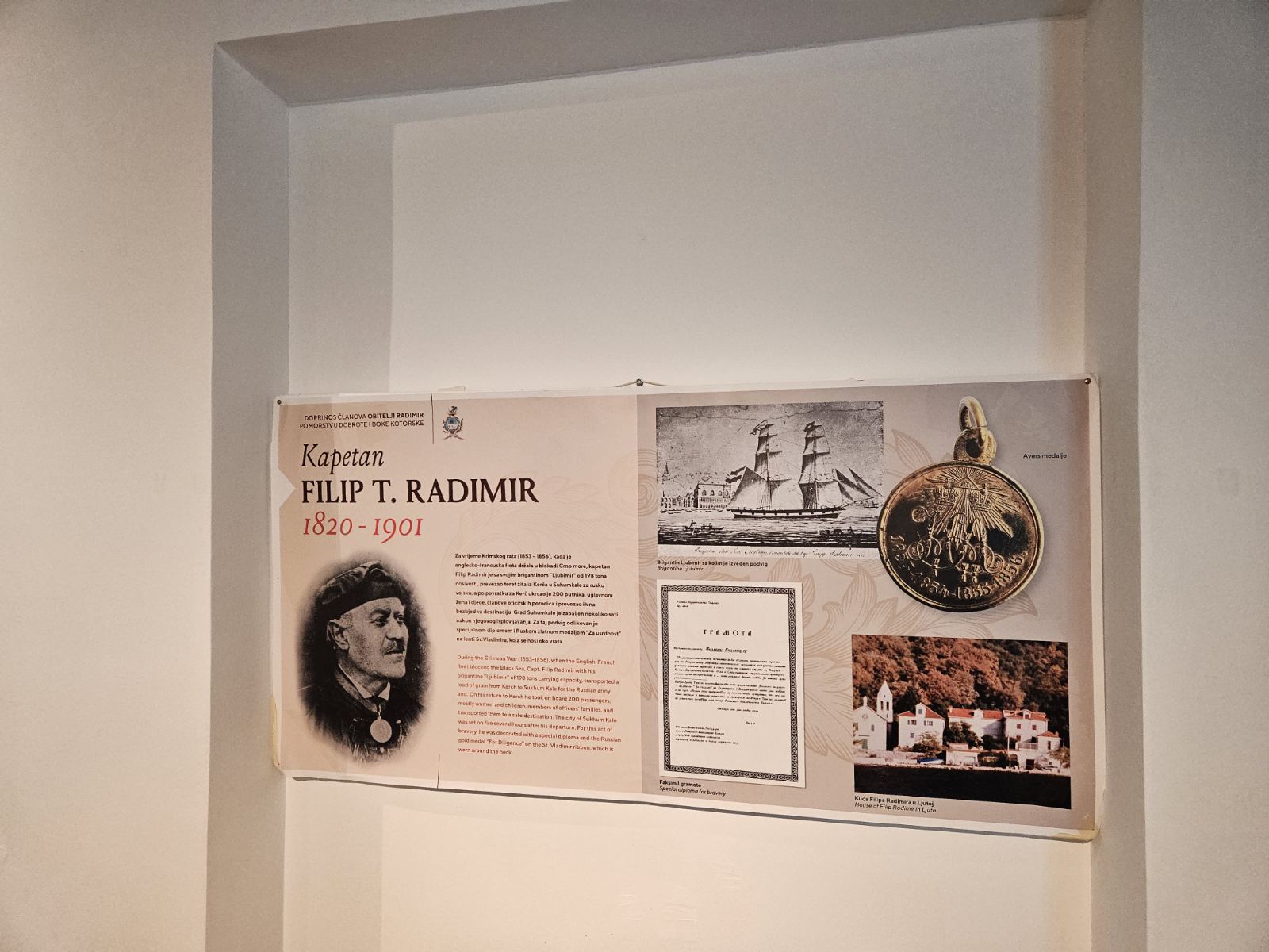 „Rješenjem Ministarstva kulture Crne Gore iz 2017. godine, Zbirka Radimir dobila je status Pokretnog kulturnog dobra od lokalnog i nacionalnog značaja. Svi predmeti Zbirke su nasljeđe uže i šire porodice Radimir i, kao takvi, predstavljaju kulturno nasljeđe ovog kraja. Na izložbi u JU Muzej i galerija Tivat biće prezentovana tematika iz oblasti pomorstva, vezana za doprinos članova porodice Radimir ukupnom pomorstvu Dobrote i Boke Kotorske“.