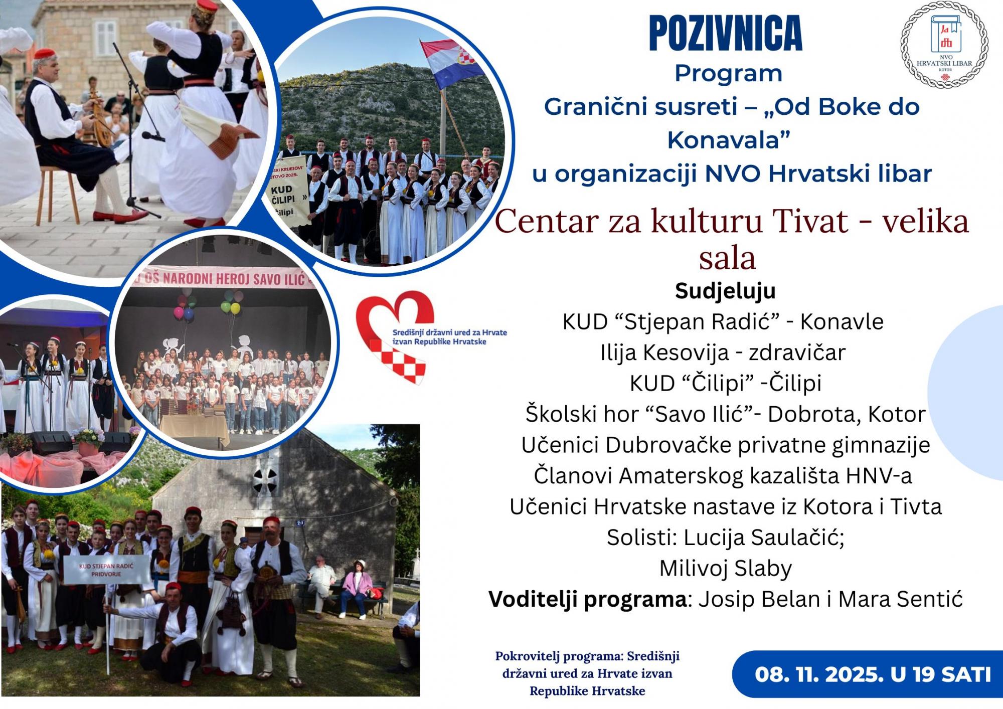 U subotu, 8. 11., u 19 sati, održat će se program „Granični susreti – od Boke do Konavala”, u organizaciji NVO Hrvatski libar, u Velikoj dvorani tivatskog Centra za kulturu.